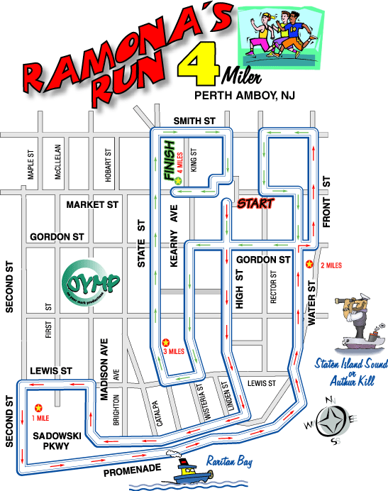 THE EVENT Holiday lights, historic landmarks and the waterfront of Raritan Bay await you at the 6th Annual Ramona’s Run in Perth Amboy. The twilight 4 mile event celebrates the holiday season with a festive atmosphere, good cheer and fun. In 2006, over 400 joined us for the fast times, great food and seasonal celebration. Runners will be treated to a fast, scenic course combining flat stretches and rolling hills. Ramona’s Run is rich with amenities including a post race buffet and party featuring ethnically diverse foods. So come join us on December 29th. Perth Amboy is easy to get to via the Garden State Parkway, NJ Turnpike, Route 287 or the Outerbridge. NUTS & BOLTS | ||||||||||||
